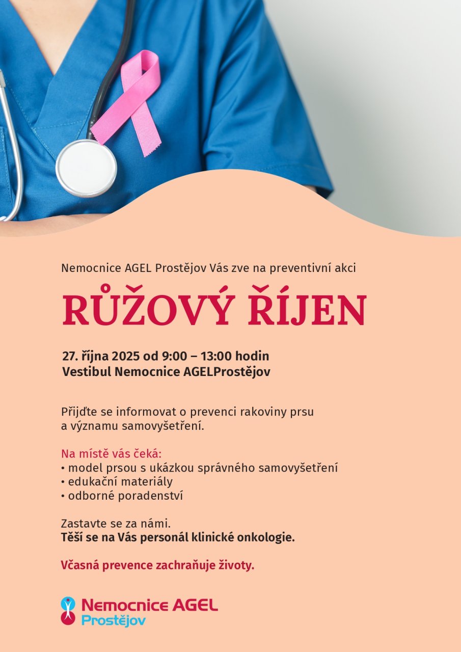 V rámci kampaně Růžový říjen připravila Nemocnice AGEL Prostějov pro veřejnost preventivní akci v pondělí 27. října od 9:00 hodin, která se uskuteční ve vestibulu nemocnice. Zájemkyně si na modelu prsou budou moci vyzkoušet správnou techniku samovyšetření a získat edukační materiály o prevenci nádorových onemocnění. Na místě budou po celou dobu k dispozici sestřičky z oddělení klinické onkologie, které poradí a zodpoví všechny dotazy. „Chceme ženám ukázat, že prevence je jednoduchá a může zachránit život. Stačí pár minut měsíčně věnovaných vlastnímu zdraví,“ doplňuje Bc. Marta Osladilová.