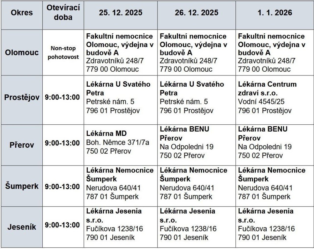 Na Štědrý den většina běžných lékáren po poledni zavře. Hned následující den ale navážou právě vybrané prodejny léků – v Prostějově to bude Lékárna U Svatého Petra, v Přerově Lékárna MD, v Šumperku Lékárna Nemocnice a v Jeseníku Lékárna Jesenia.