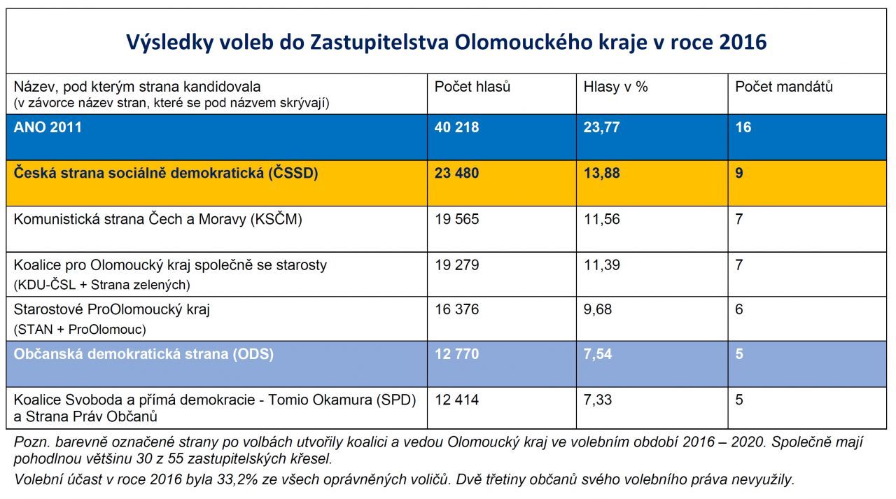 Jak je z uvedeného výčtu mandátů zřejmé, v roce 2016 volby ovládlo hnutí ANO, které pak utvořilo koalici s ČSSD a ODS. Lídr hnutí ANO Oto Košta se záhy po usednutí do hejtmanského křesla těsně spojil s Jiřím Rozbořilem, bývalým hejtmanem za ČSSD. Rozbořilova kontroverzní pověst a zejména trestní stíhání tomuto kamarádství dobrou reklamu nedělaly. Nejen koaliční strany na krajském úřadě měly z takto tvořeného tandemu osypky.